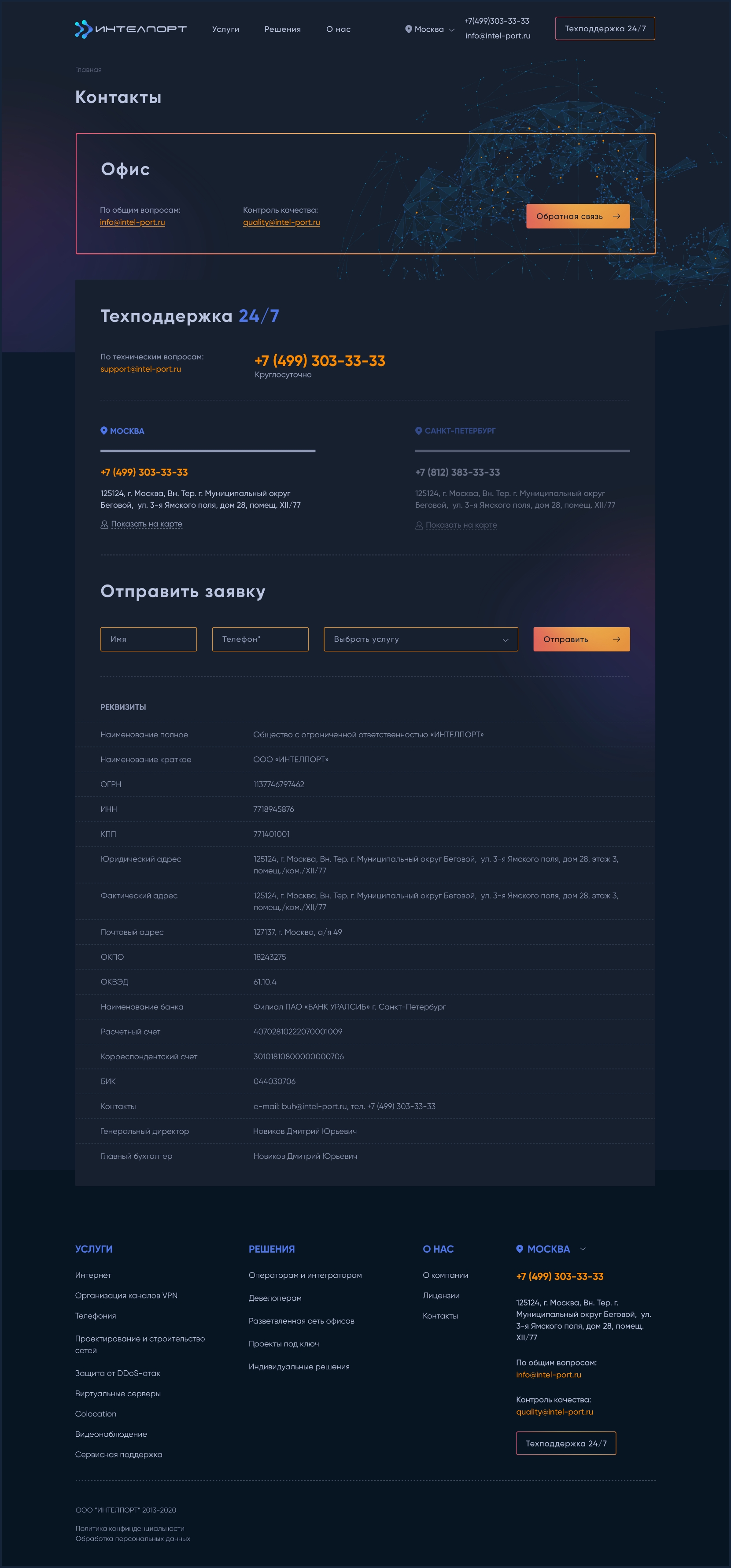 Реализовали акцентный блок с контактами компании в модной стилистике цифровизации, перекликающейся с оформлением главной страницы.