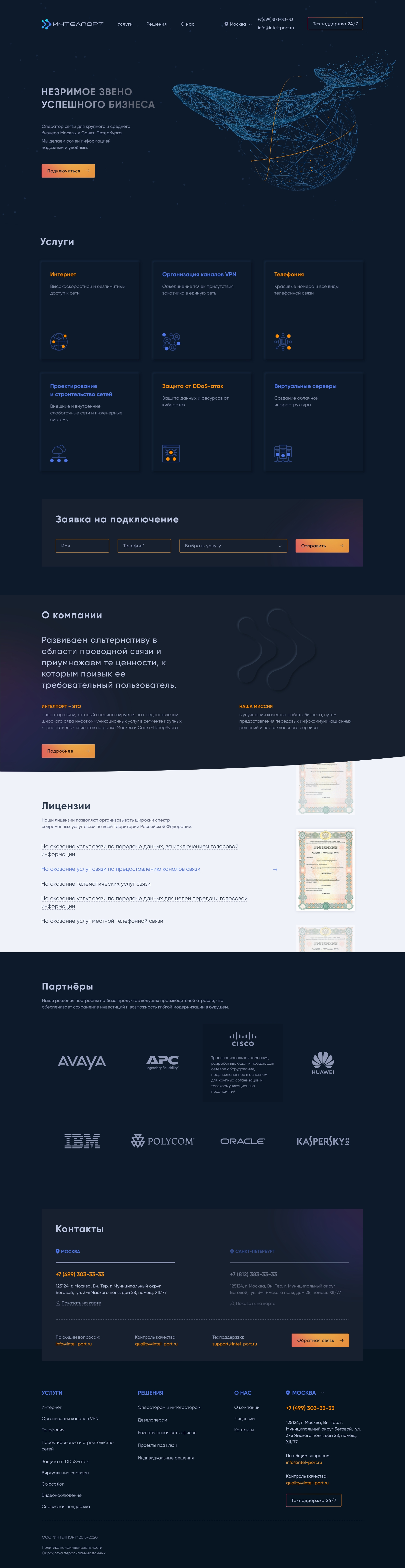 Визуально и технически устарела, не соответствовала имиджу компании телеком сегмента, что и захотел изменить заказчик. Наш прототип дизайна включает в себя визуальное оформление и структуру сайта. Мы выбрали современный и запоминающийся стиль, удачно подчеркивающий направленность компании.