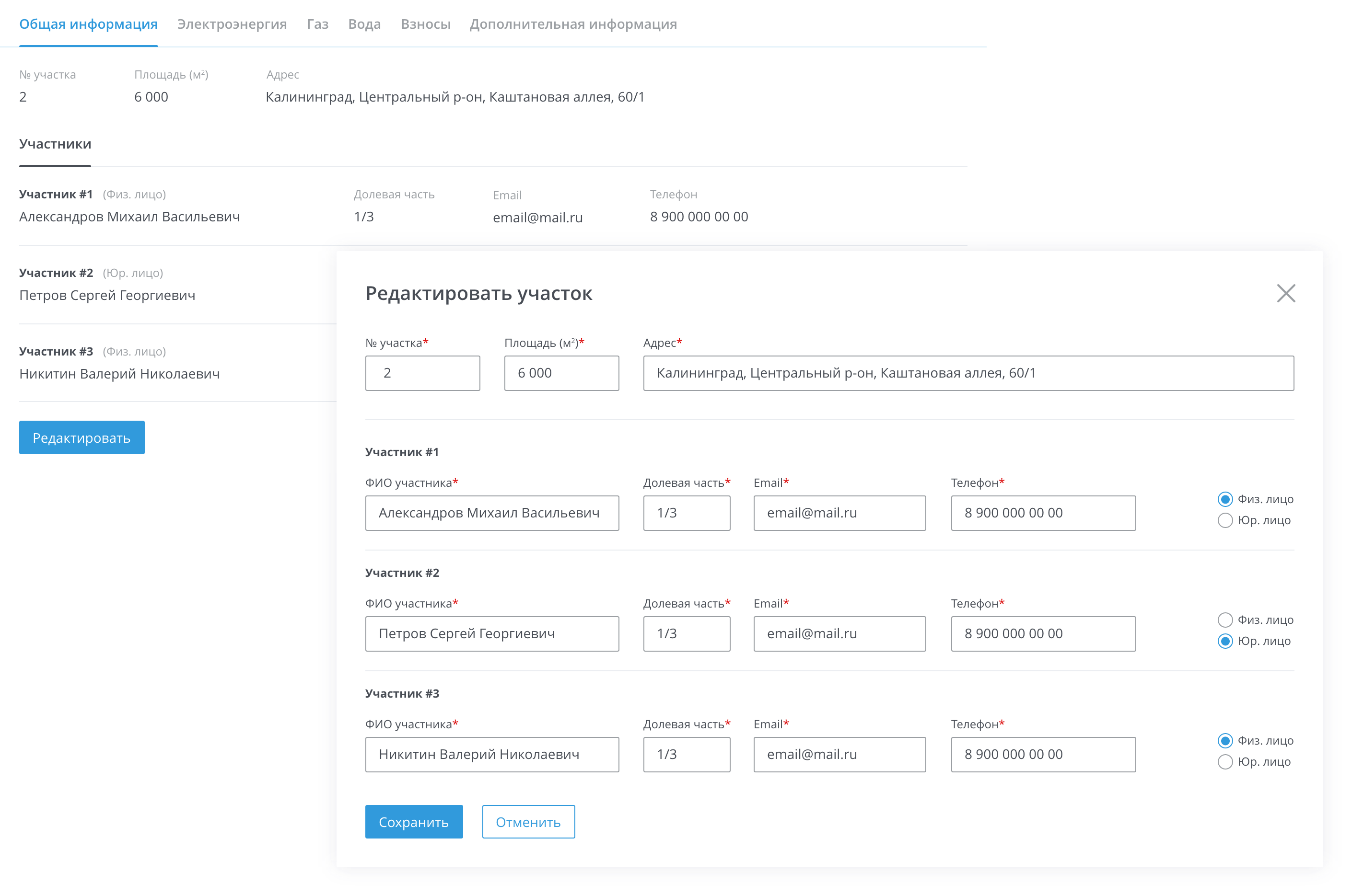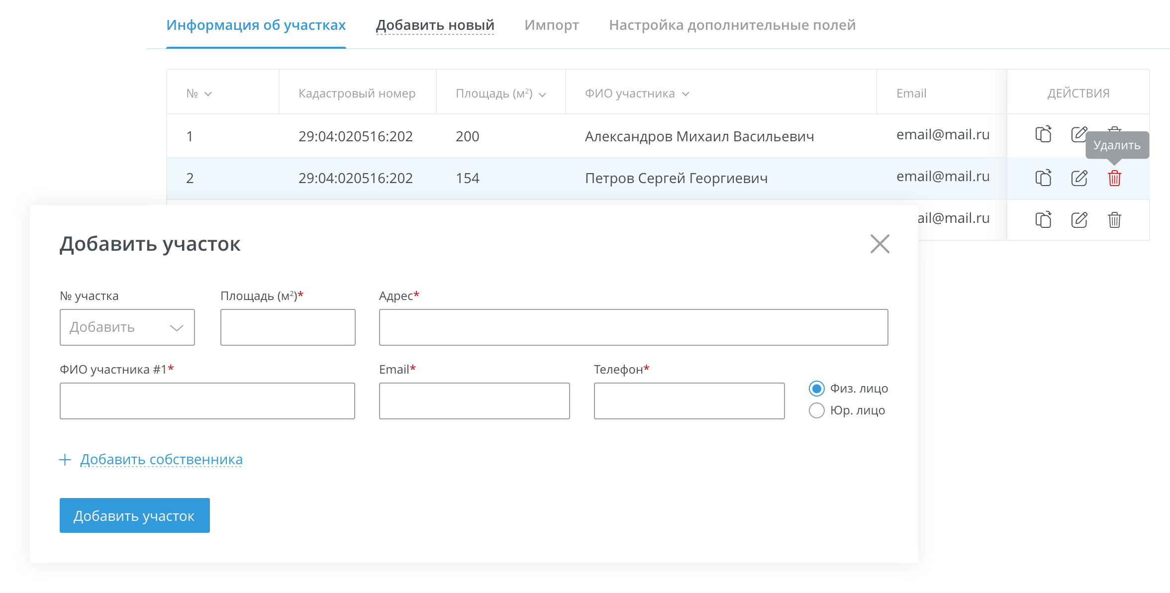 Сервис предлагает удобный фукнционал для работы с информацией об участках и их владельцах, включая возможность редактирования данных, а также удобное добавление новых участков.