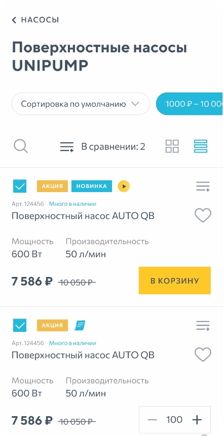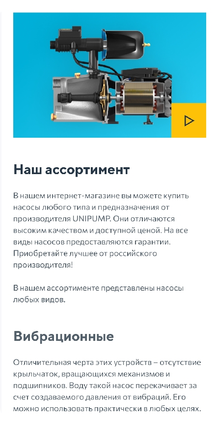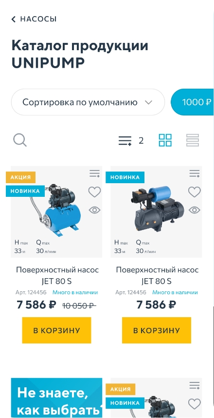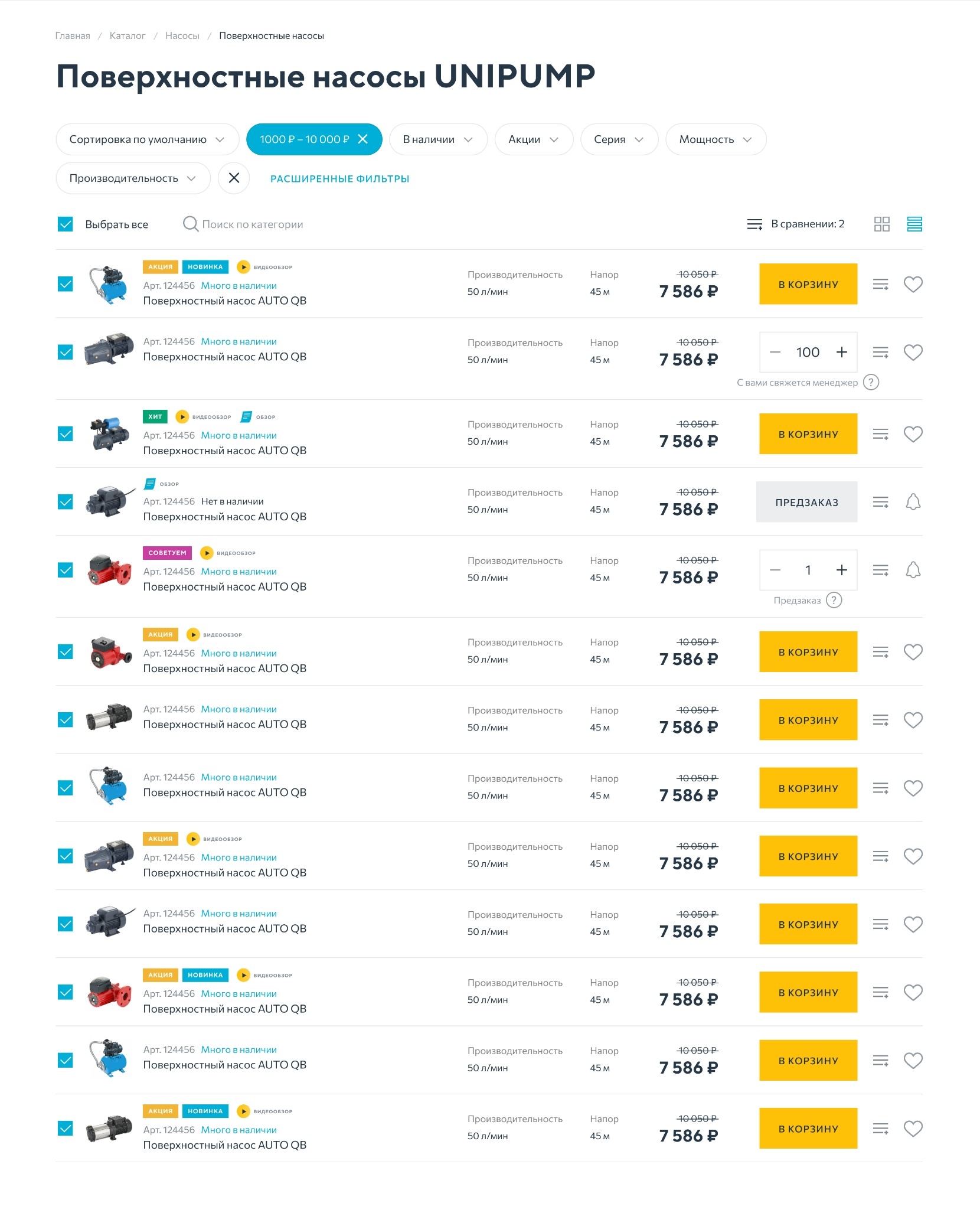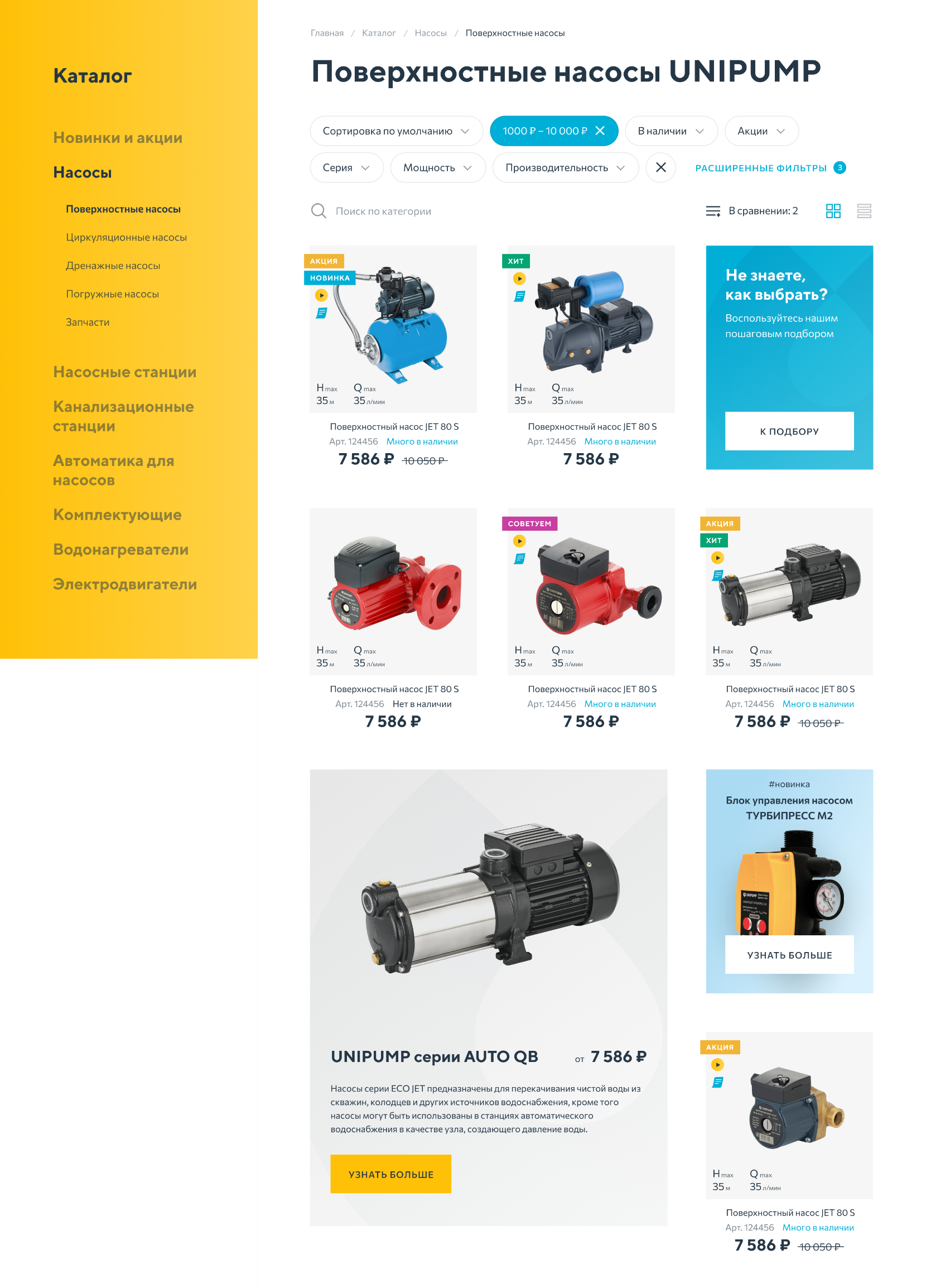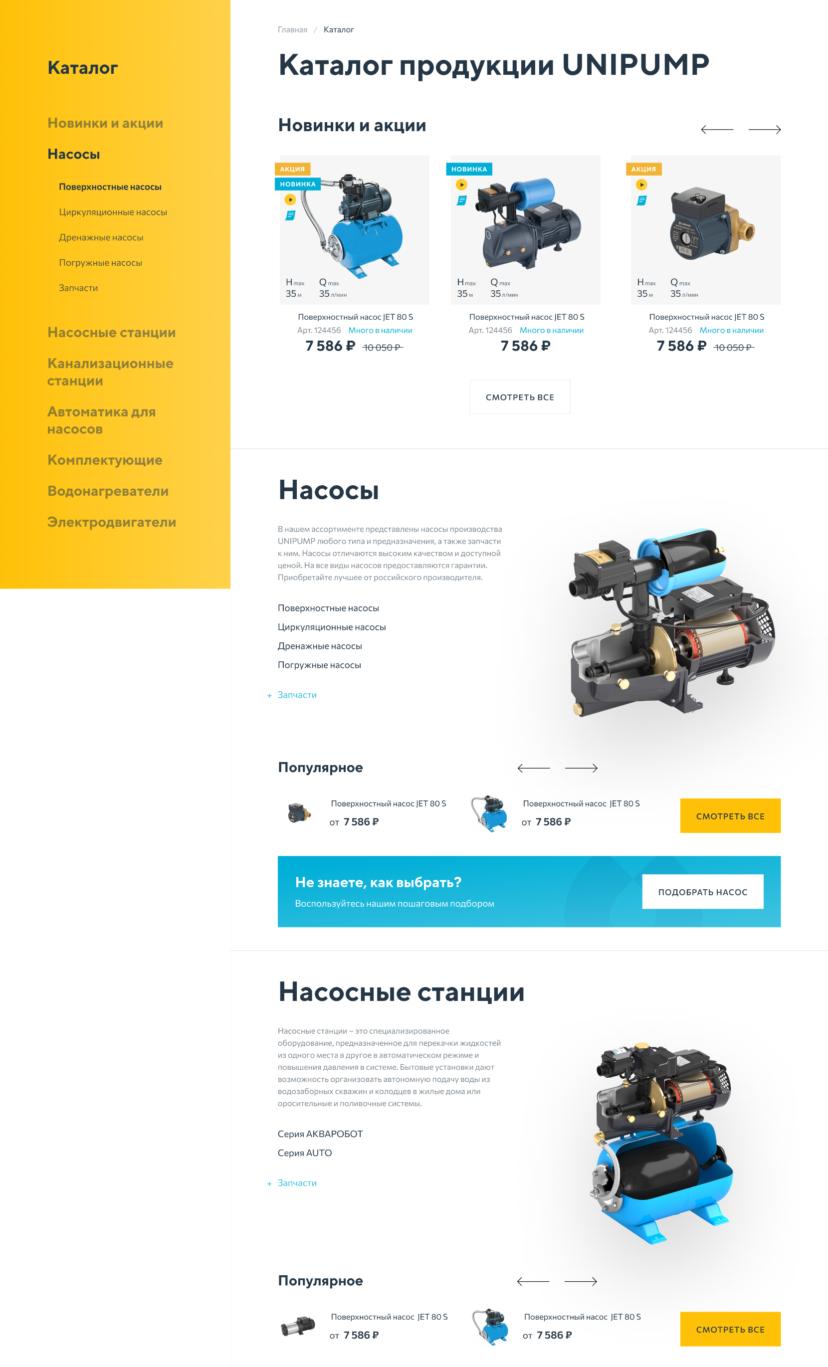 Отображение всех категорий и подкатегорий каталога. Первой категорией демонстрируются насосы.