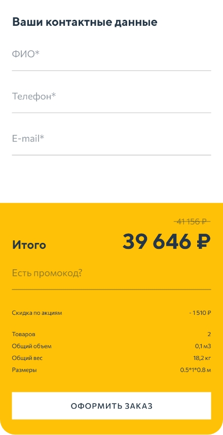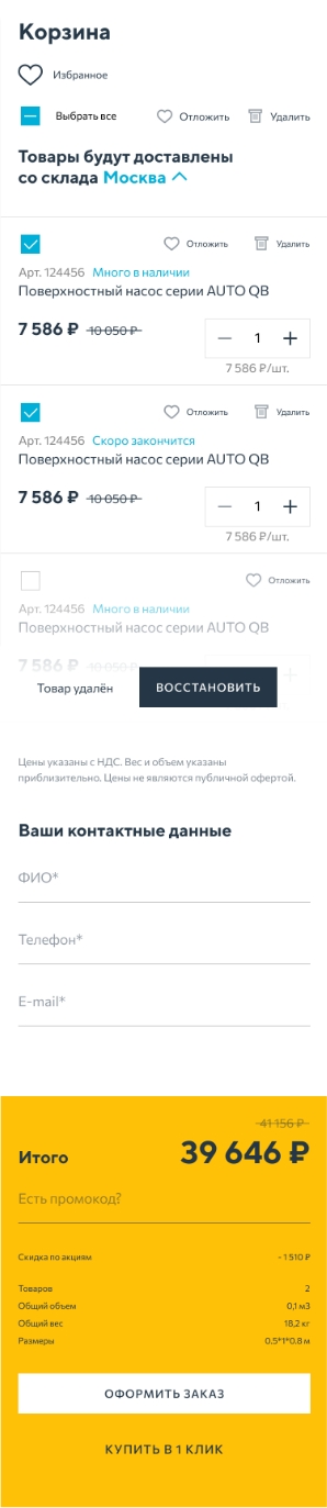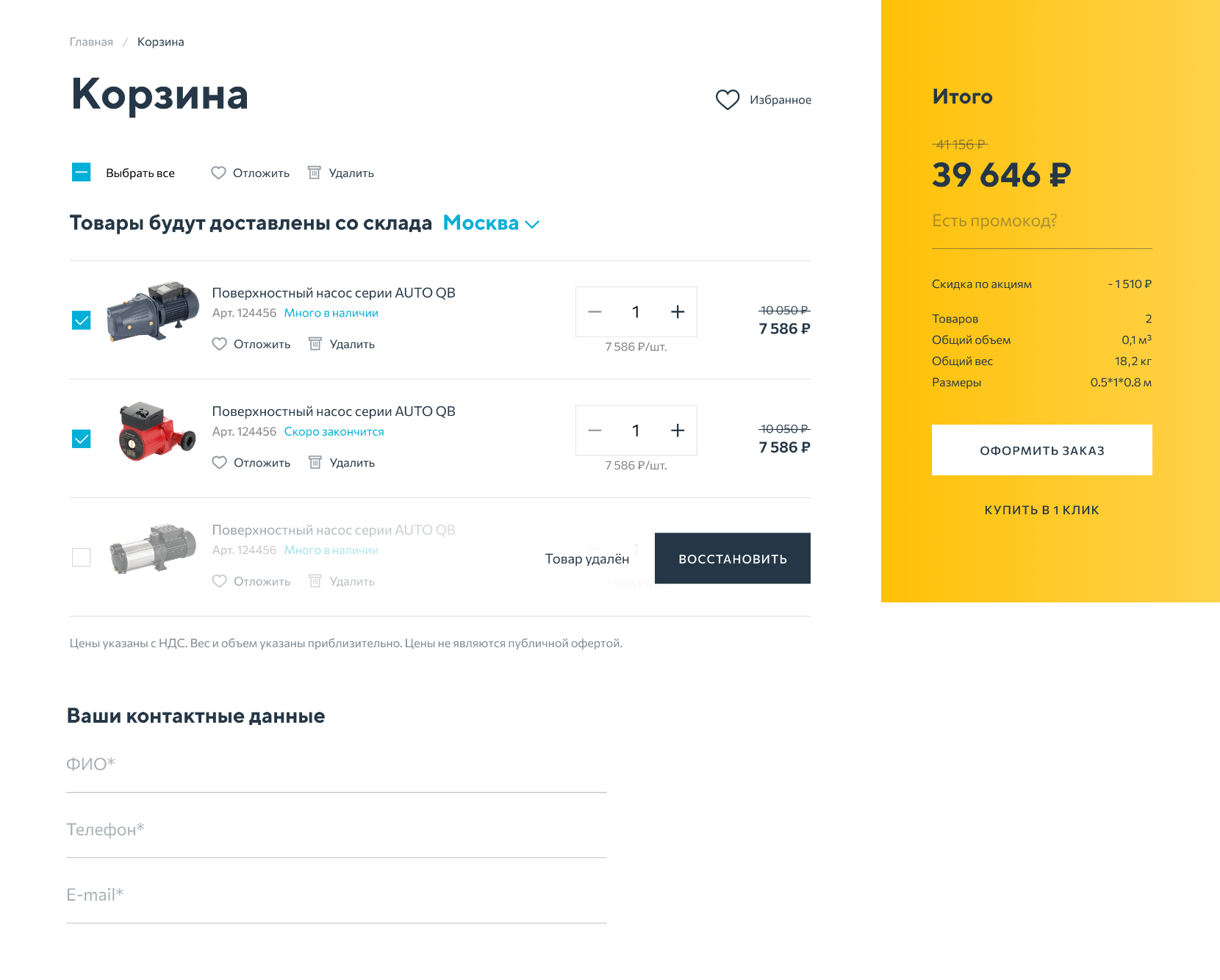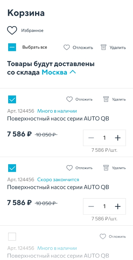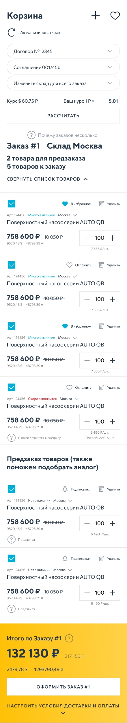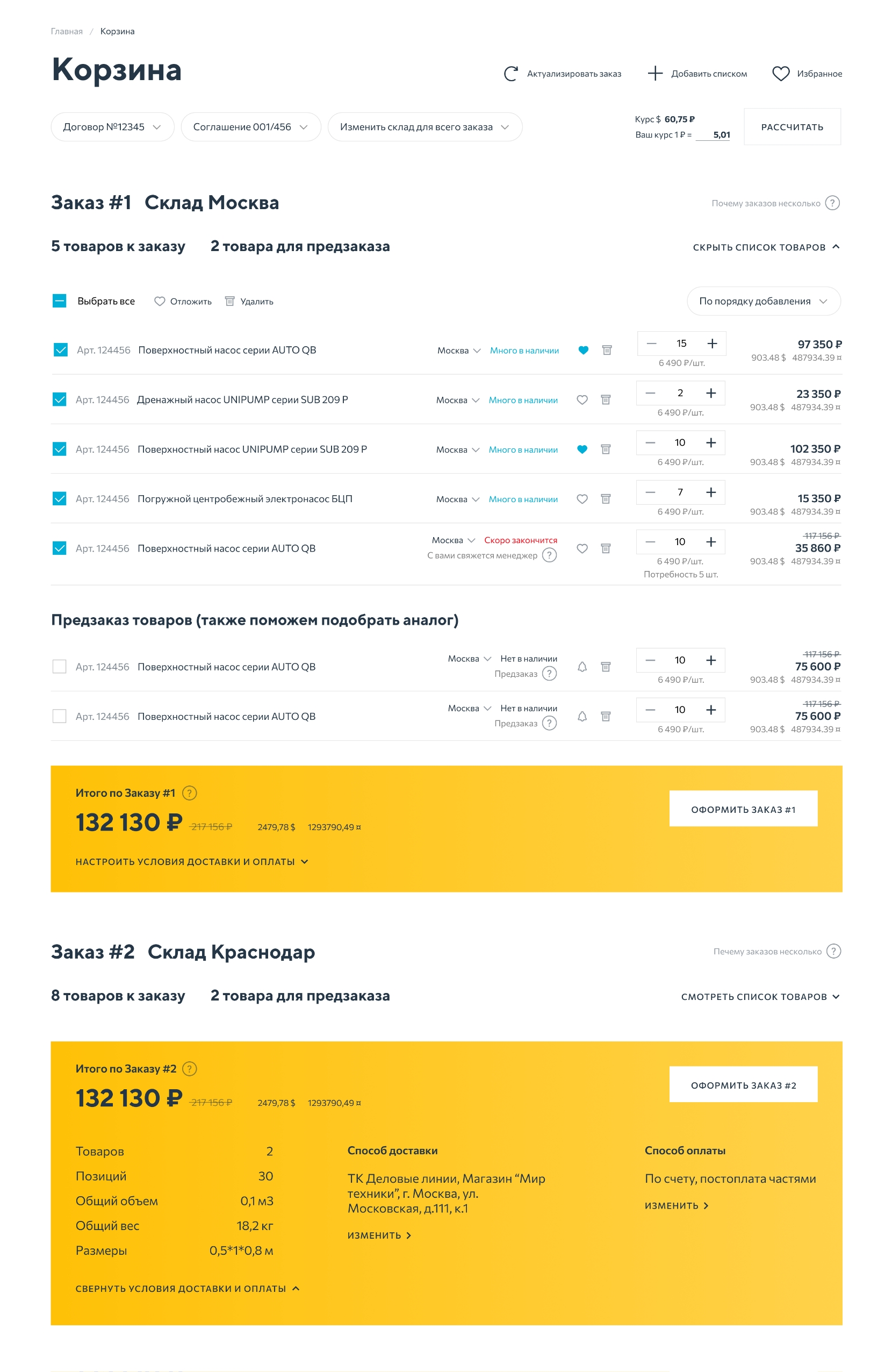 В случае, если выбранные товары находятся на разных складах, то корзина делится на разные заказы по складам.