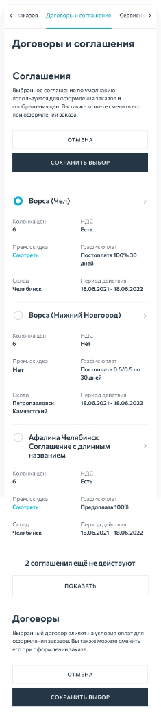 Реализована возможность переключения между соглашениями с автоматическим применением соответствующих условий к товарам в корзине.